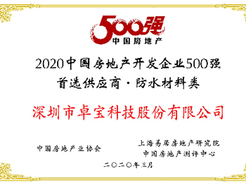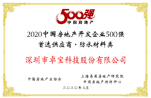 日前,“2020中国房地产金采供应链合作大会”于北京隆重举行。活动现场发布了《2020中国房地产500强开发企业配套供应链典型品类履约信用评价报告》,并对十二个行业的优秀信用标杆企业代表进行授牌表彰,卓宝科技获评防水材料行业履约信用乐荐企业。